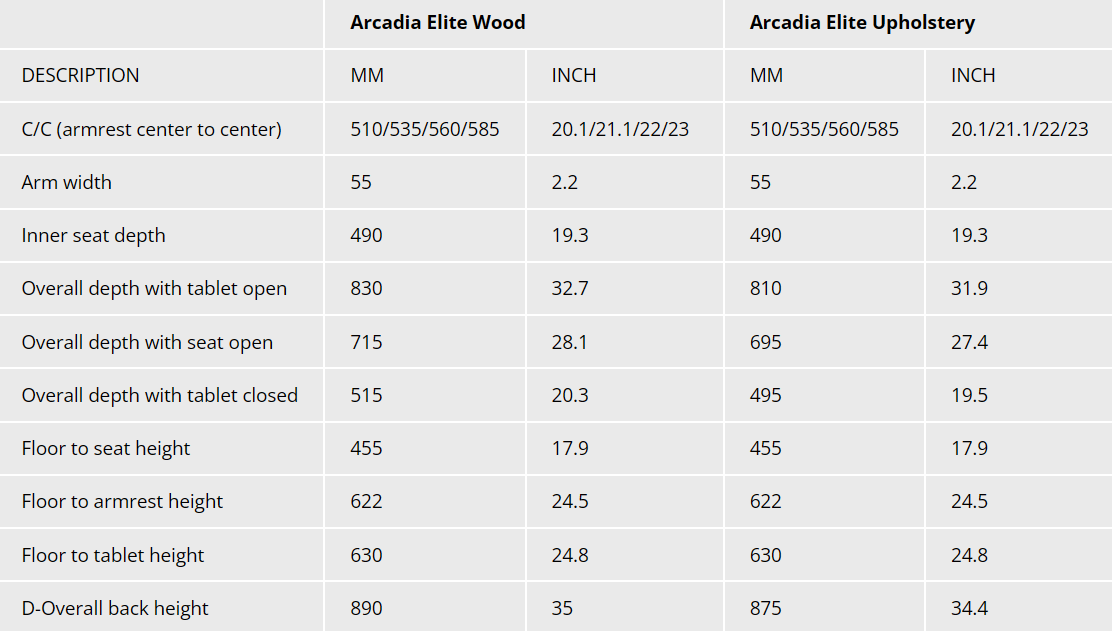 ARCADIA ELITE is specially designed to be compact, stylish and comfortable. With only 20.5” seat width and anti-panic writing tablet, it is ideal for venues and lecture theaters where space is at a premium. The wooden outerback, seat pan and armrest with nice finishing not only add a feel of elegancy to your space but also make your daily cleaning and maintenance easy.