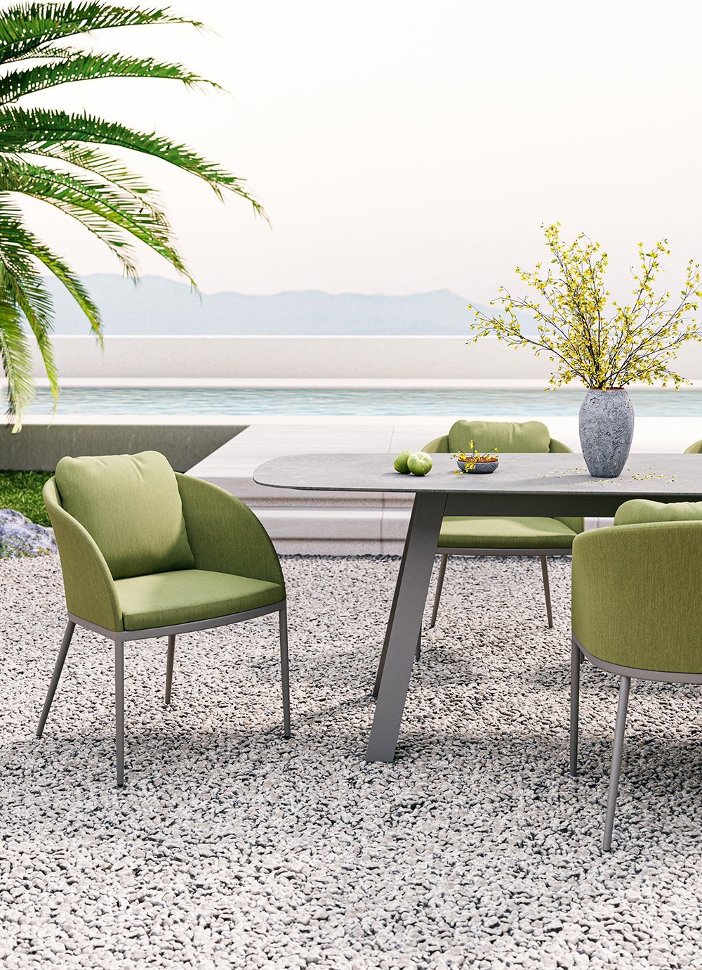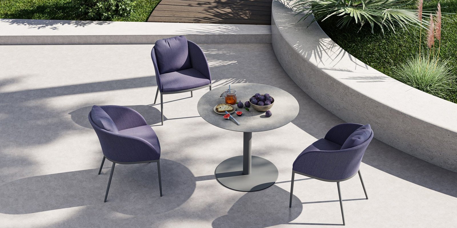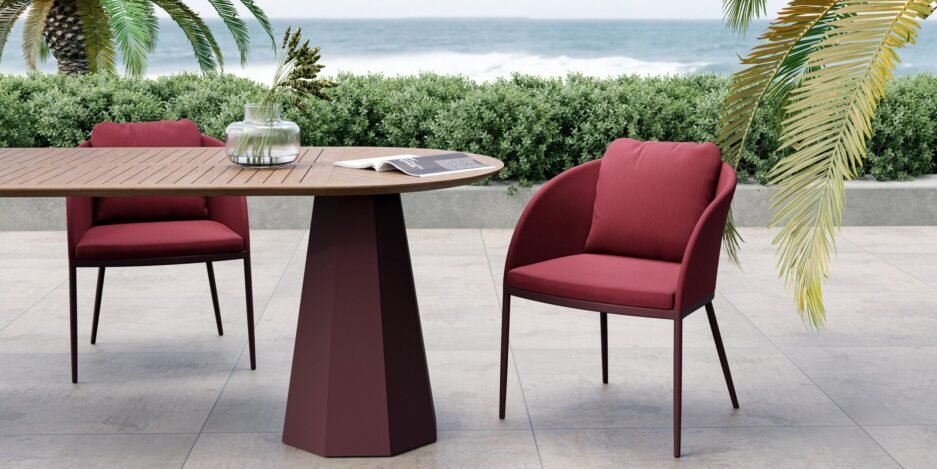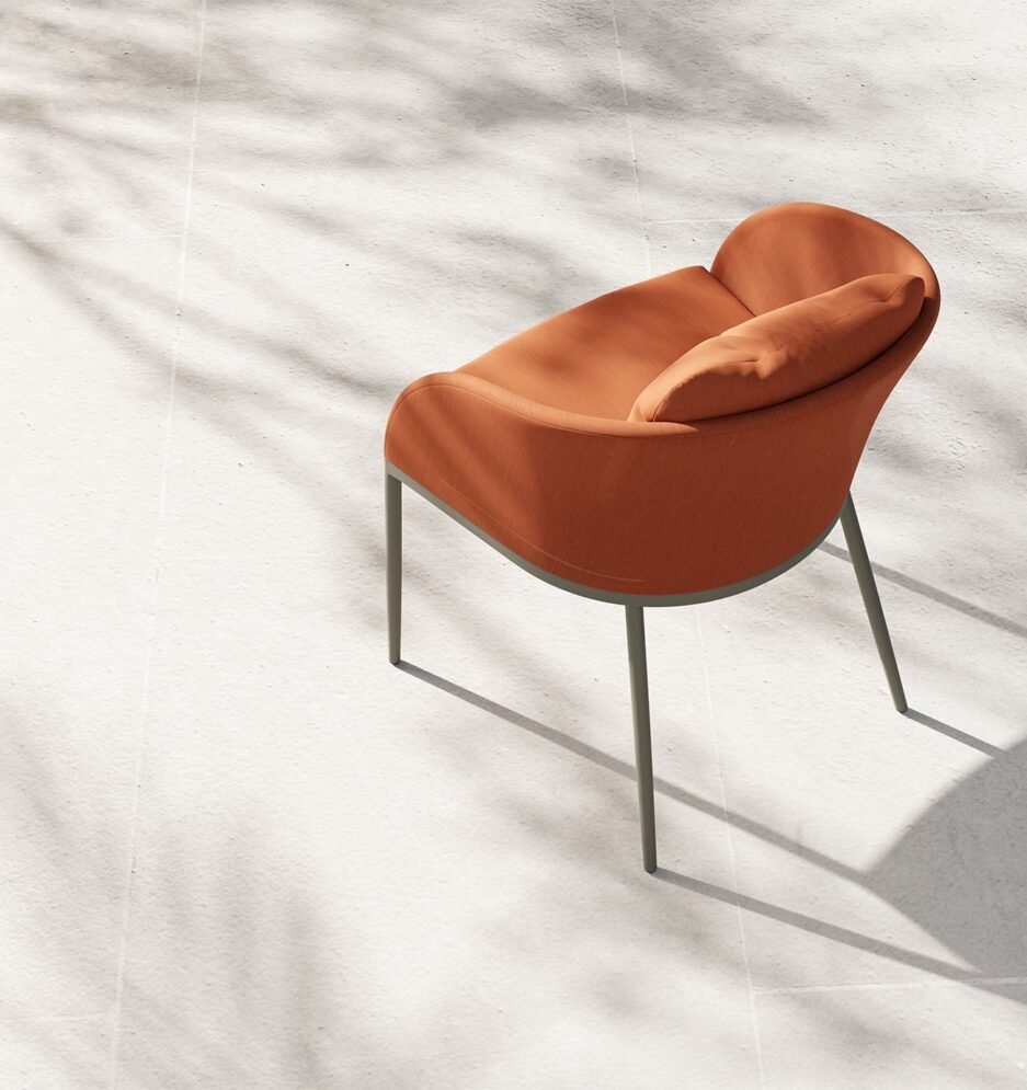 With its strong style, it makes an impressive aesthetic contribution to different outdoor spaces such as terraces, gardens, verandas, and outdoor spaces of restaurants and hotels. With its upholstery, which can be matched with all colours in the chart and is suitable for outdoor use, and its conical aluminium legs, it allows for creating site-specific, customized design alternatives even in one single model.